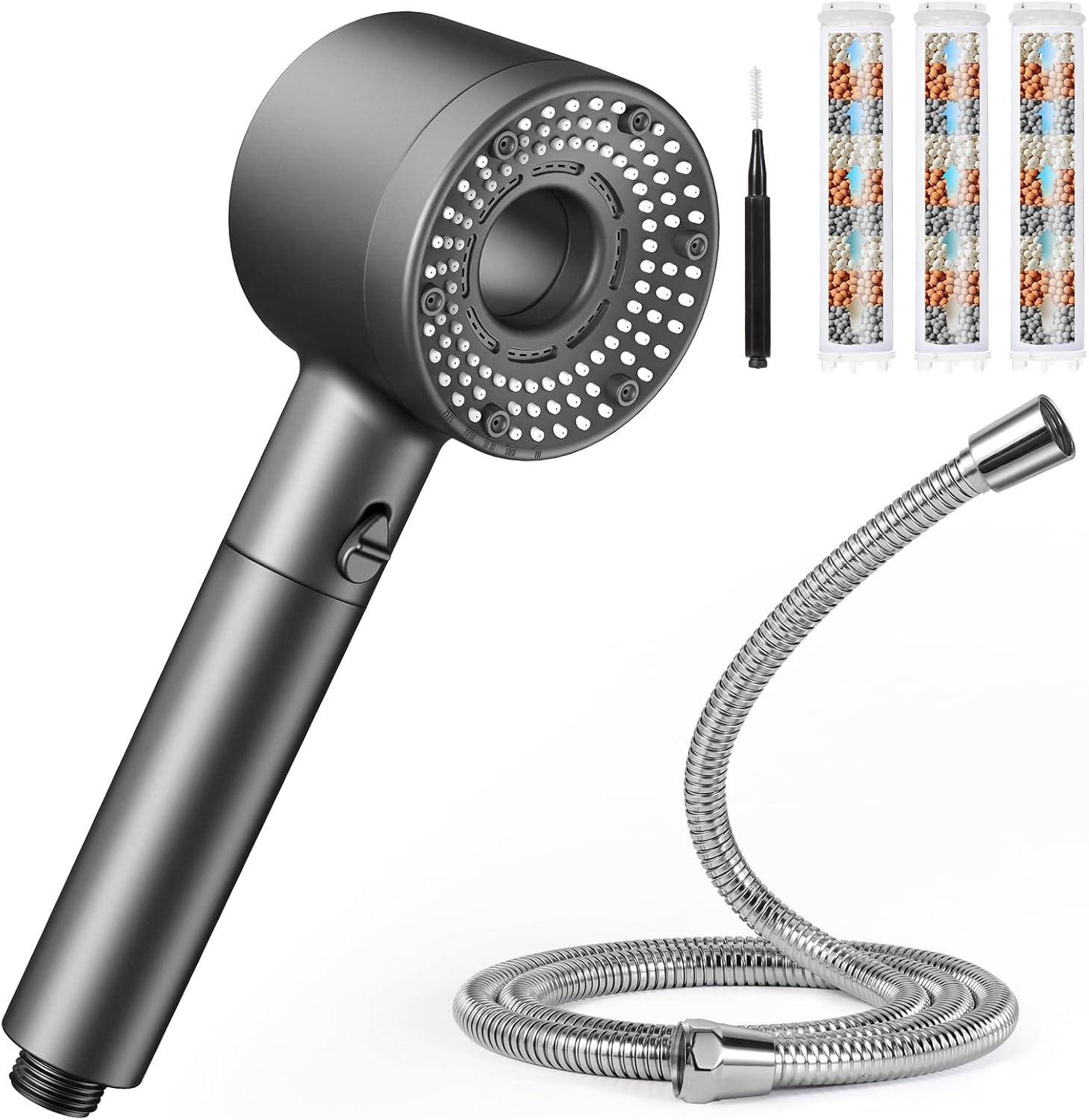 - Filtrazione pura in tre fasi: Il nostro filtro anticalcare per doccia è dotato di un sistema di filtrazione multistrato, che elimina efficacemente impurità dall'acqua, proteggere la tua pelle e i tuoi capelli